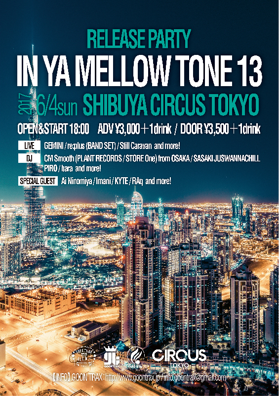 7/31(sun) 東京 渋谷 CIRCUS TOKYO “IN YA MELLOW TONE 12″発売記念! 「IN YA MELLOW TONE TOUR with re:plus & Ai Ninomiya & Part Time Cooks」